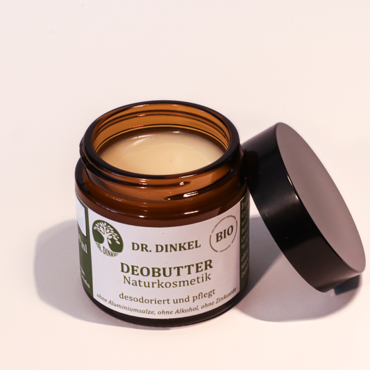 Dr. Dinkel Deobutter enthält ausschließlich wertvolle, reine pflanzliche Inhaltsstoffe wie hochwertige pflanzliche Öle, Buttern und Wachs - alles in Bio-Qualität, mit hochwertigen Fettsäuren und jeder Menge Vitamine sowie Antioxidantien, die die Haut pflegen und schützen können. Außerdem enthält sie Natron (Natriumhydrogencarbonat), ein bewährtes Hausmittel gegen Gerüche, das effektiv den Schweißgeruch neutralisiert.